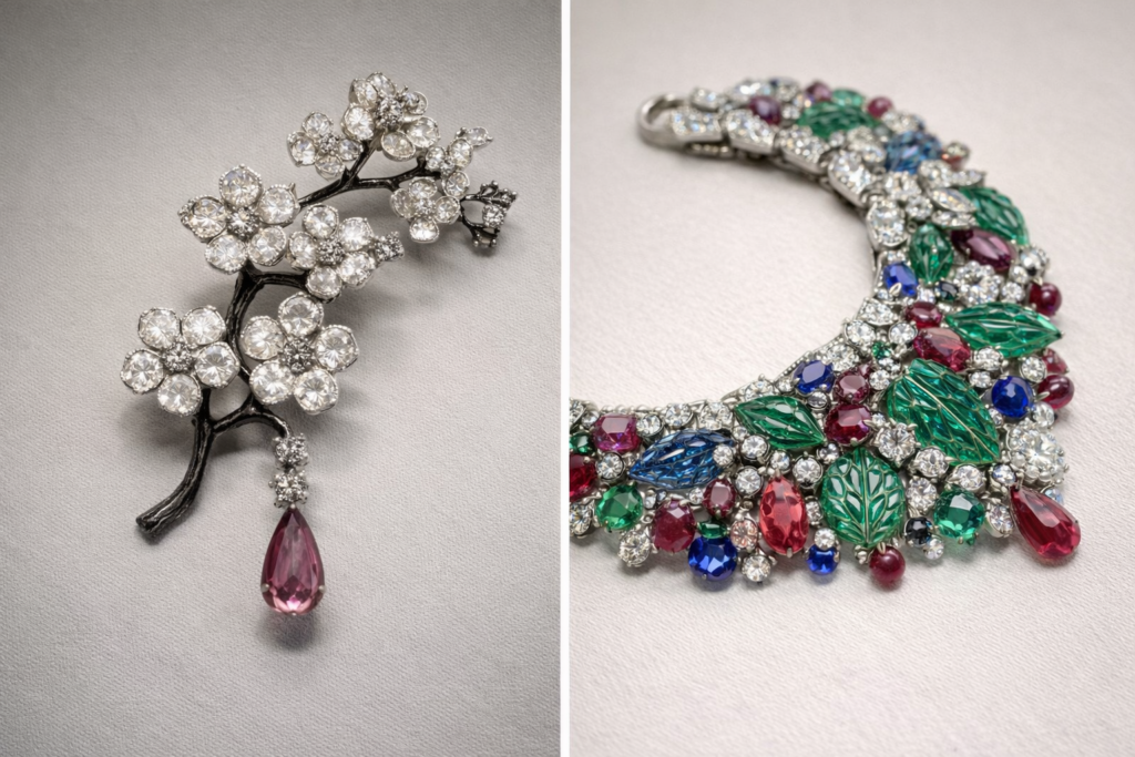 Kolorowe kompozycje, inspirowane indyjską biżuterią dworską, stały się symbolem luksusu międzywojnia. Dziś osiągają na aukcjach rekordowe ceny i należą do najbardziej pożądanych obiektów kolekcjonerskich na świecie.